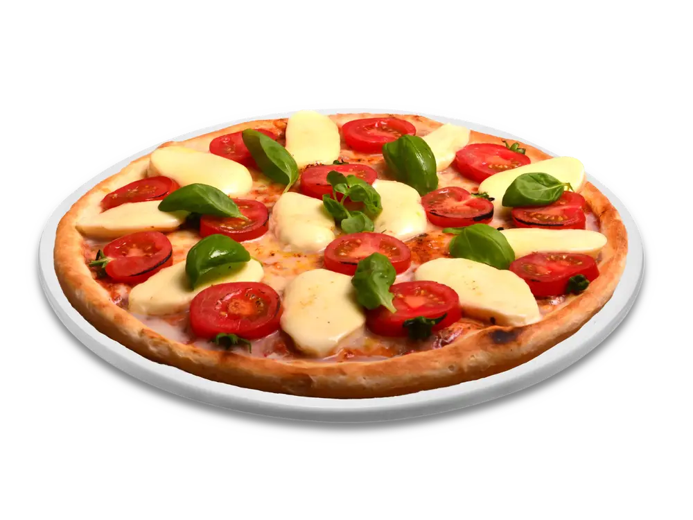 Frischer Teig, Tomatensauce, echter Käse, Mozzarella, Tomatenscheiben, frischer Basilikum